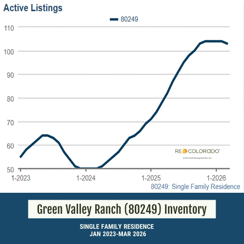 Inventory is one of the biggest shifts we’ve seen over the last three years. In Green Valley Ranch (80249), active listings have climbed from roughly the mid-50s in early 2023, dipped slightly in 2024, and then surged to over 100 homes by early 2026. That’s nearly a doubling of available inventory from the lows.